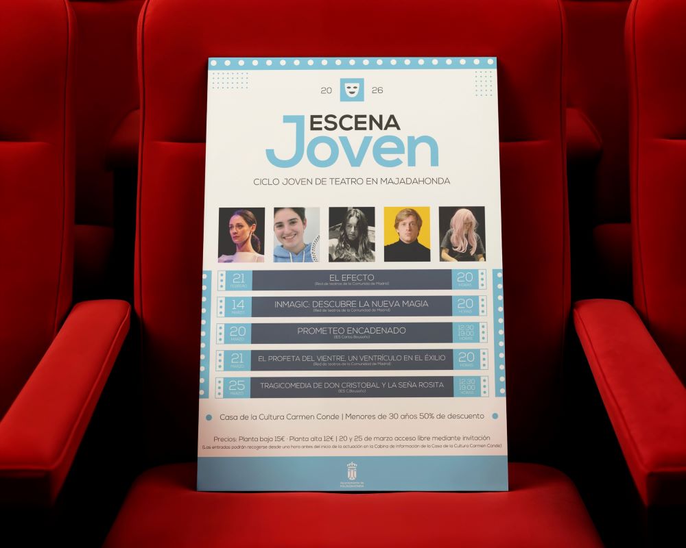 El Ayuntamiento de Majadahonda presenta una nueva edición de “Escena Joven”, el ciclo teatral con el que se pretende promover la afición de los jóvenes por las artes escénicas y atraer su atención por el teatro. Este año el Ayuntamiento, a través de la concejalía de Cultura, ha programado cinco obras que se representarán en el Teatro de la Casa de la Cultura “Carmen Conde”.