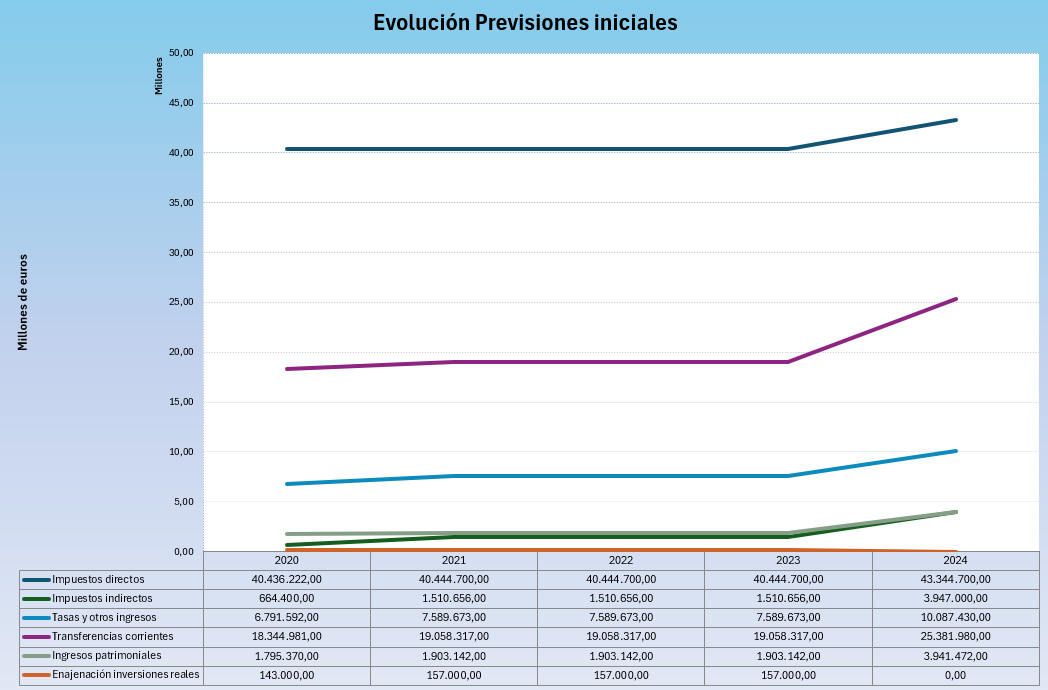 Las previsiones de ingresos en los presupuestos iniciales aprobados en los últimos cinco ejercicios, desglosados por capítulos.