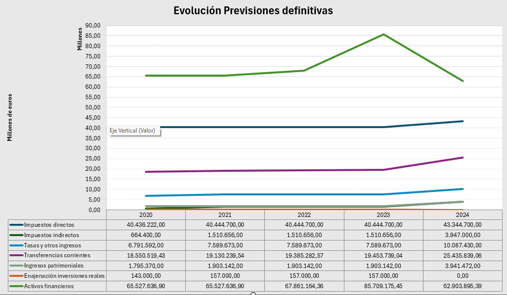 Las previsiones definitivas de ingresos en los presupuestos, resultantes de las distintas modificaciones presupuestarias de cada uno de los últimos cinco ejercicios, desglosados por capítulos.